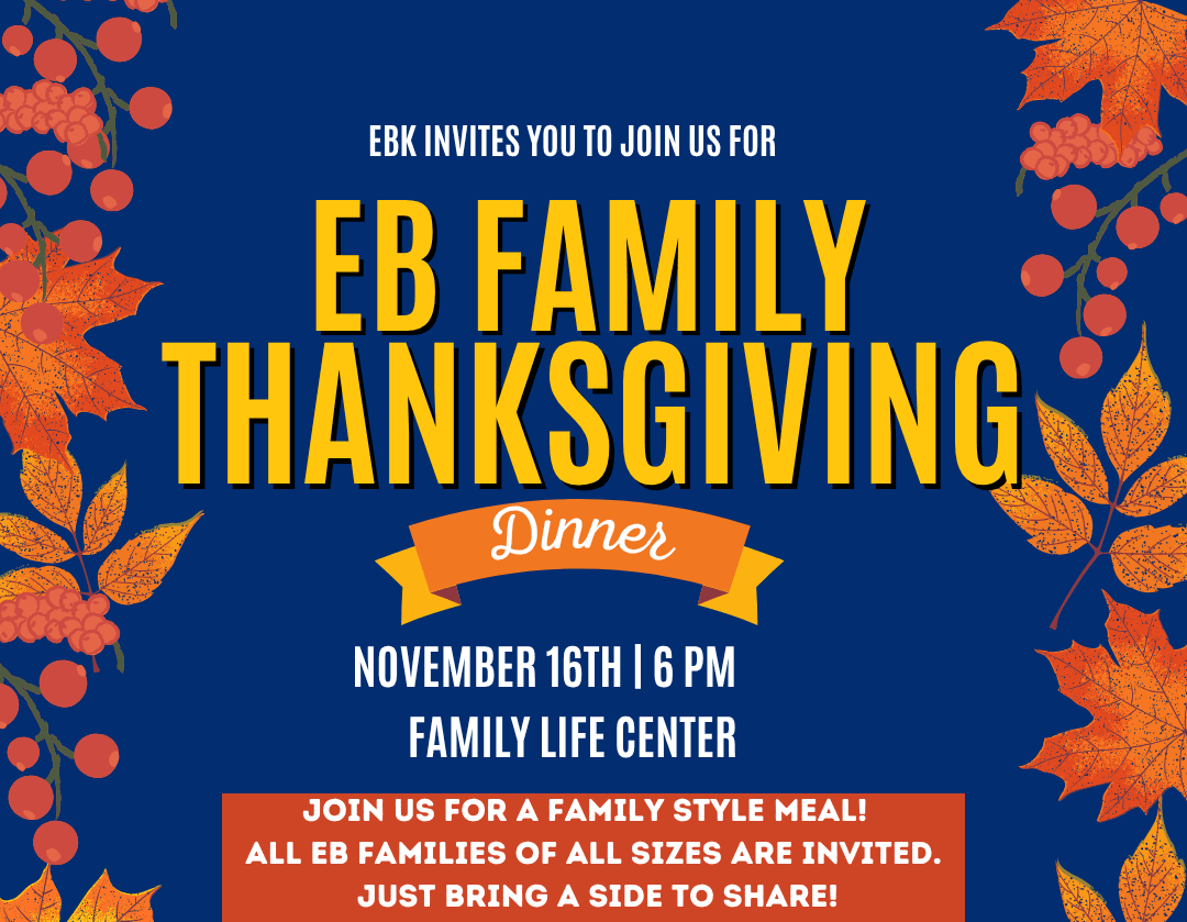 All are invited to share in a meal of thanks at the EB Family Thanksgiving Dinner in the FLC at 6:00PM. Please use the following link to Sign up to bring a dish. Sign UP HERE
